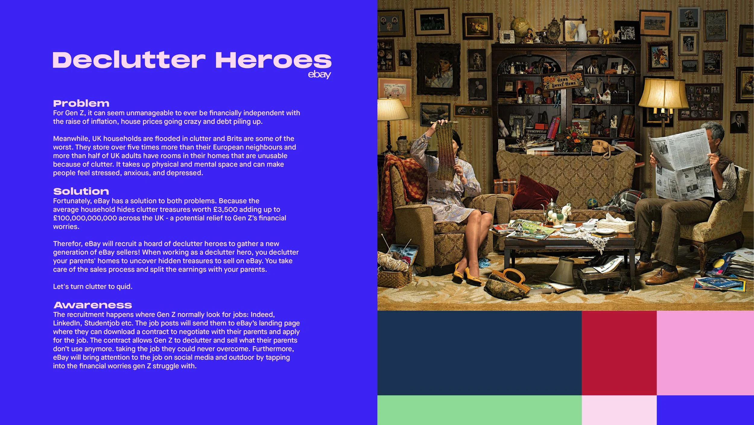 OUR SOLUTION: In the UK, young people’s biggest struggles are their financial situation and living paycheck to paycheck. Ebay will bring Gen Z to their market place by facilitating a way for them to sell their parents household clutter. This solves both a comprehensive household clutter problem in the UK and secures an extra income for young Gen Z’s too.